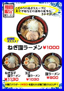 期間限定で人気メニューでした「塩ラーメン」がレギュラーメニューになりました。是非一度ご賞味くださいませ。