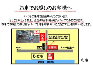 2026年1月1日より当店の駐車場がK'sパークのみになります。