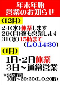 年末年始は両店舗↑上記の通り営業させていただきます。宝塚店は通常火曜日定休日ですが、12/23㈫は15時まで営業致します。よろしくお願いいたします。