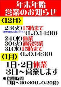 12月23日火曜日 通常は定休日でお休みですが、15時まで営業いたします。